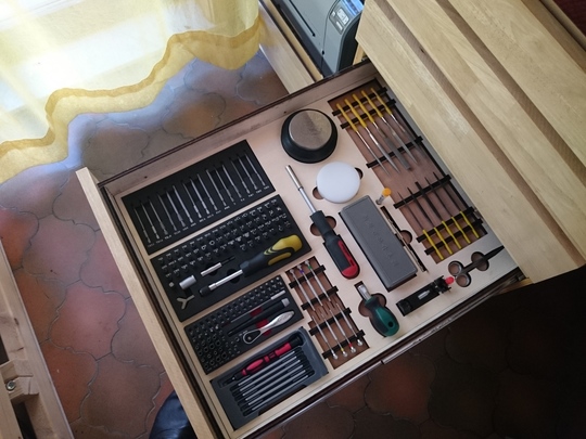 Everything except for the desk-surface, -sides, drawer fronts and cable tray, was lasercut. Which allowed me to keep very close tolerances and results in a perfect fit without the need to keep extra space for manual alignment.